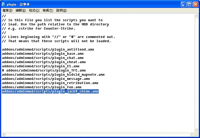 6.在plugin.ini加入addons/adminmod/scripts/plugin_jack9_chime.amx
