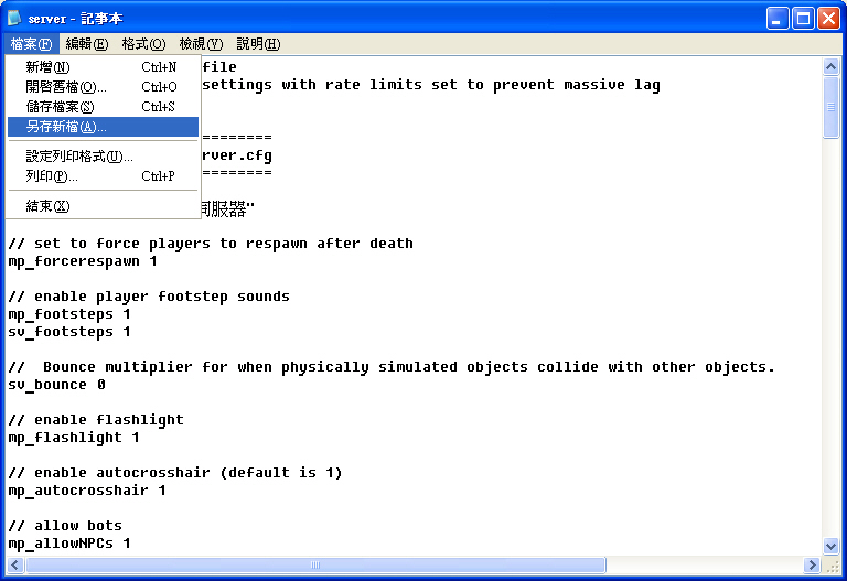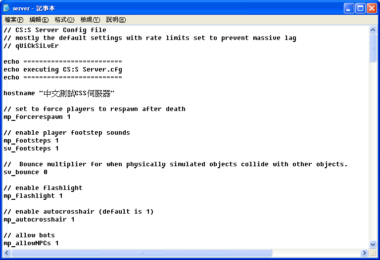 1.開啟D:\HL2Server\cstrike\cfg下的server.cfg