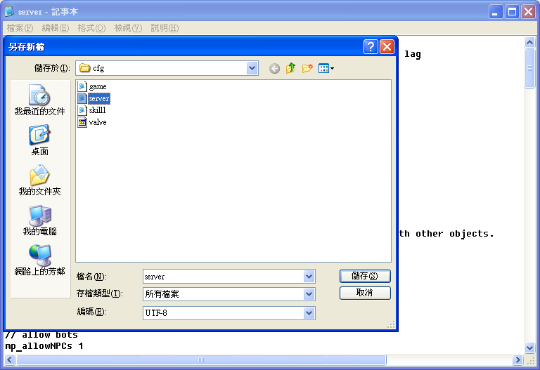 4.存檔類型用所有檔案,編碼選UTF-8,檔名用一樣的檔名覆蓋原來的server.cfg