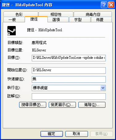 3.在目標輸入後面加入以下資料 -update cstrike D:\HLServer
