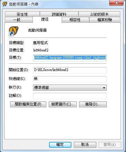 3.接下來到D:\HLServer\left4dead2對srcds.exe建立捷徑並修改新增捷徑內容如下