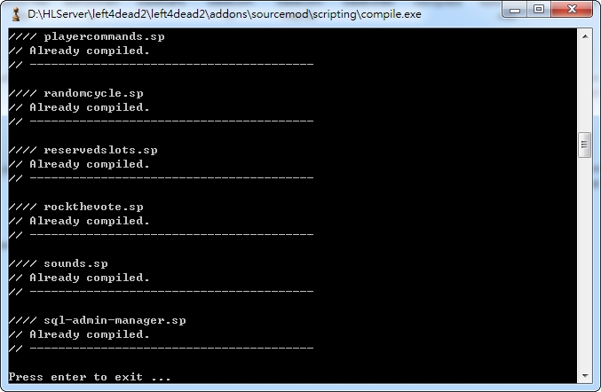 編譯完成的檔案會在D:\HLServer\left4dead2\left4dead2\addons\sourcemod\scripting\compiled裡面