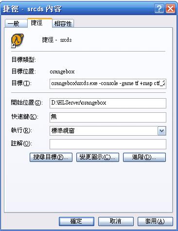 捷徑內容輸入D:\HLServer\orangebox\srcds.exe orangebox\srcds.exe -console -game tf +map ctf_2fort +maxplayers 24